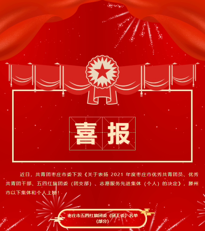 喜報(bào) 近日,共青團(tuán)棗莊市委下發(fā)《關(guān)于表揚(yáng) 2021 年度棗莊市優(yōu)秀共青團(tuán)員、優(yōu)秀共青團(tuán)干部、五四紅旗團(tuán)委(團(tuán)支部)、志愿服務(wù)先進(jìn)集體(個(gè)人)的決定》,滕州市以下集體和個(gè)人上榜!棗莊市五四紅旗團(tuán)委(團(tuán)工委)名單(部分)棗莊市五四紅旗團(tuán)支部(團(tuán)總支)名單(部分)棗莊市優(yōu)秀共青團(tuán)員名單(