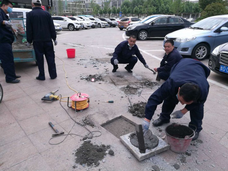 物業(yè)對損壞道路地磚進行修補對草坪進行修剪